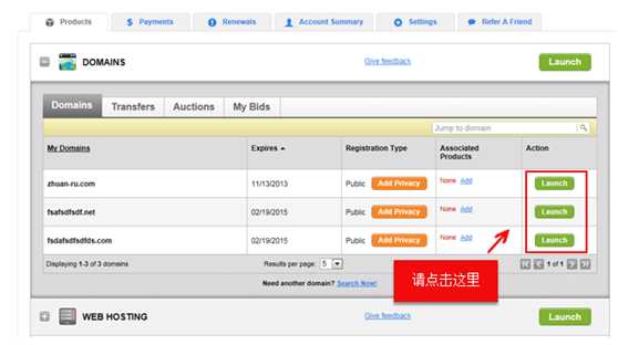 3、展开域名列表后,找到需要修改 DNS 的域名,点击对应的【Launch】按钮。
