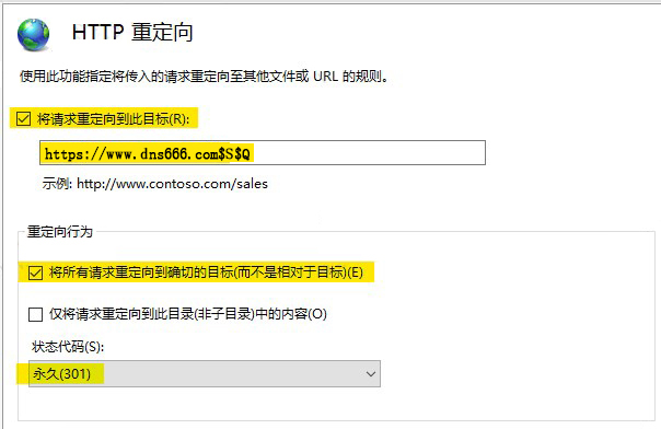 <httpRedirect enabled="true" destination="https://www.dns666.com$S$Q" exactDestination="true" httpResponseStatus="Permanent" />