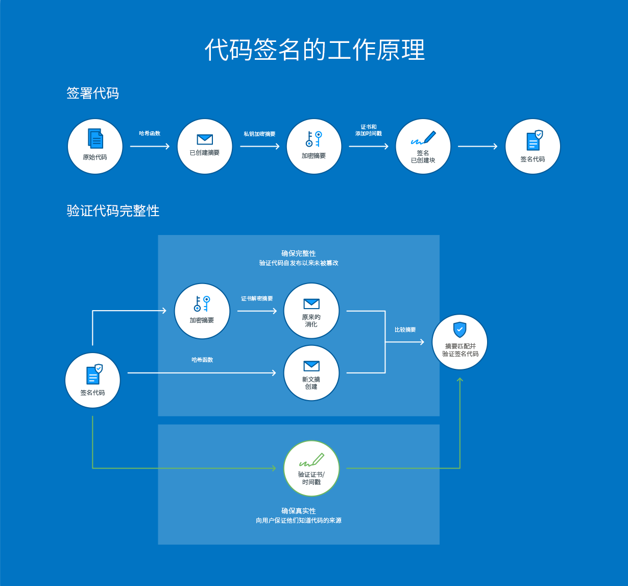 关于代码签名证书的工作原理,主要分为签署代码和验证代码的完整性,下图可以很好的诠释: