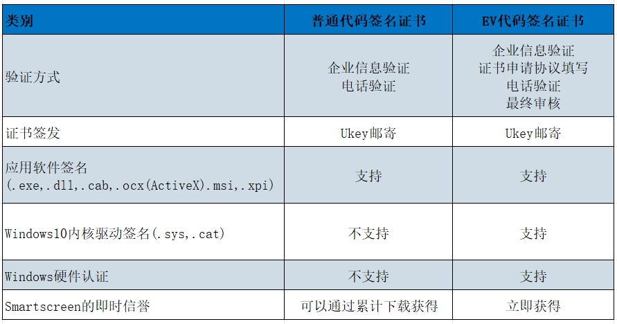 普通代码签名证书和EV代码签名证书的区别见下图: