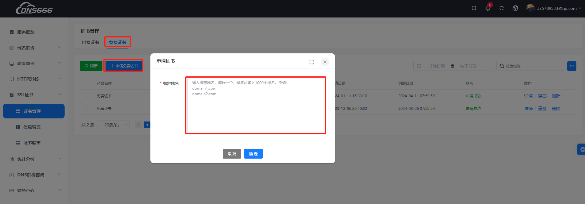 在弹出框内容输入域名,免费SSL证书仅支持单域名 如 dns666.com(赠送www.dns666.com)/ a.dns666.com / b.dns666.com 等