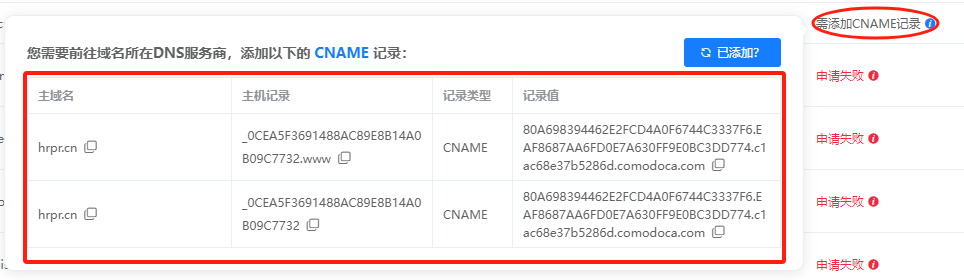 如状态为【申请失败】请检查解析是否正确,重新解析或者删除重新申请。