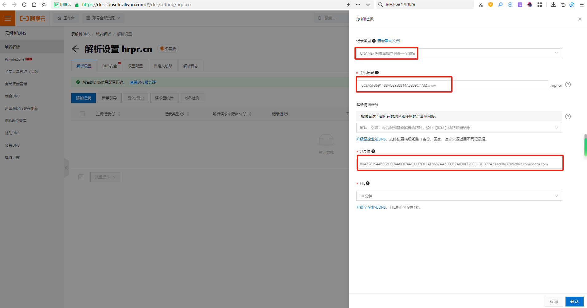 第三步:点击申请列表后面 【需添加CNAME记录】弹出弹窗,按照弹窗进行别名解析