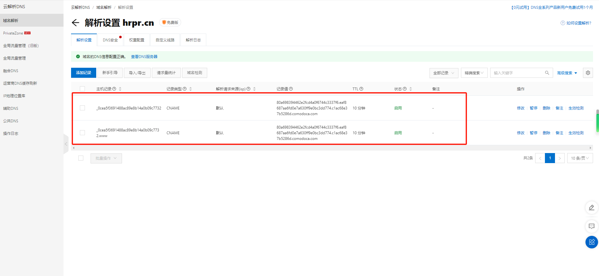 添加完成CNAME(别名解析)后,形成两条解析记录 如下图: