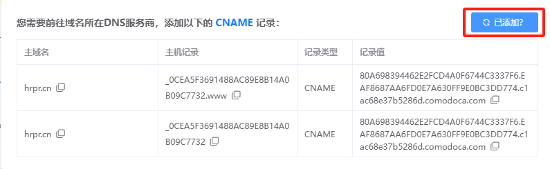 第五步:回到平台申请列表 —— 点击【已添加】验证解析记录