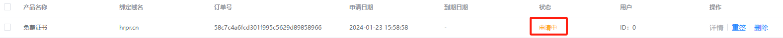 第六步:验证解析记录后,点击【刷新】如下图状态【申请中】说明验证成功,等待签发。
