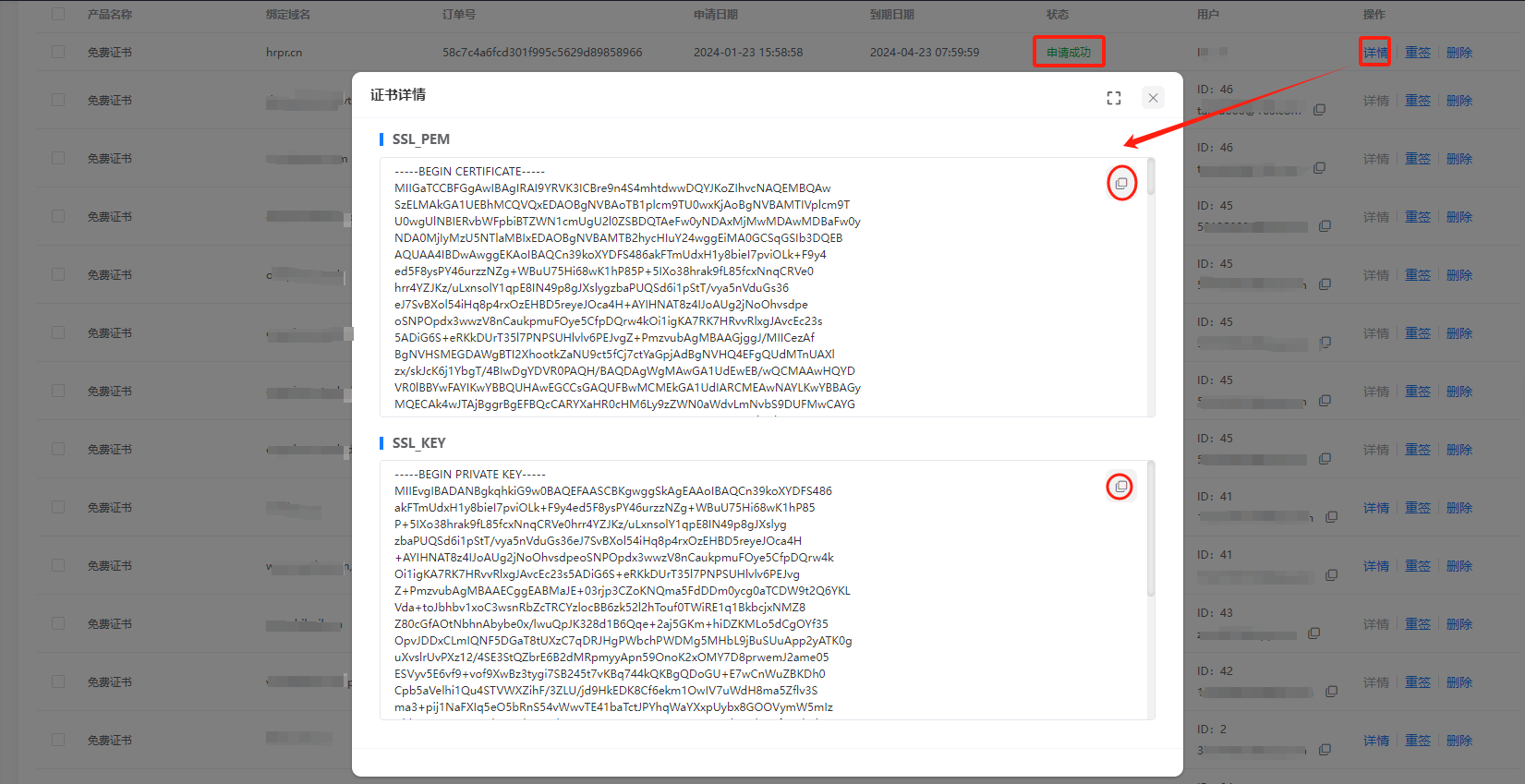 第七步:签发成功,状态为【申请成功】- 点击【详情】获取证书 PEM 及 KEY